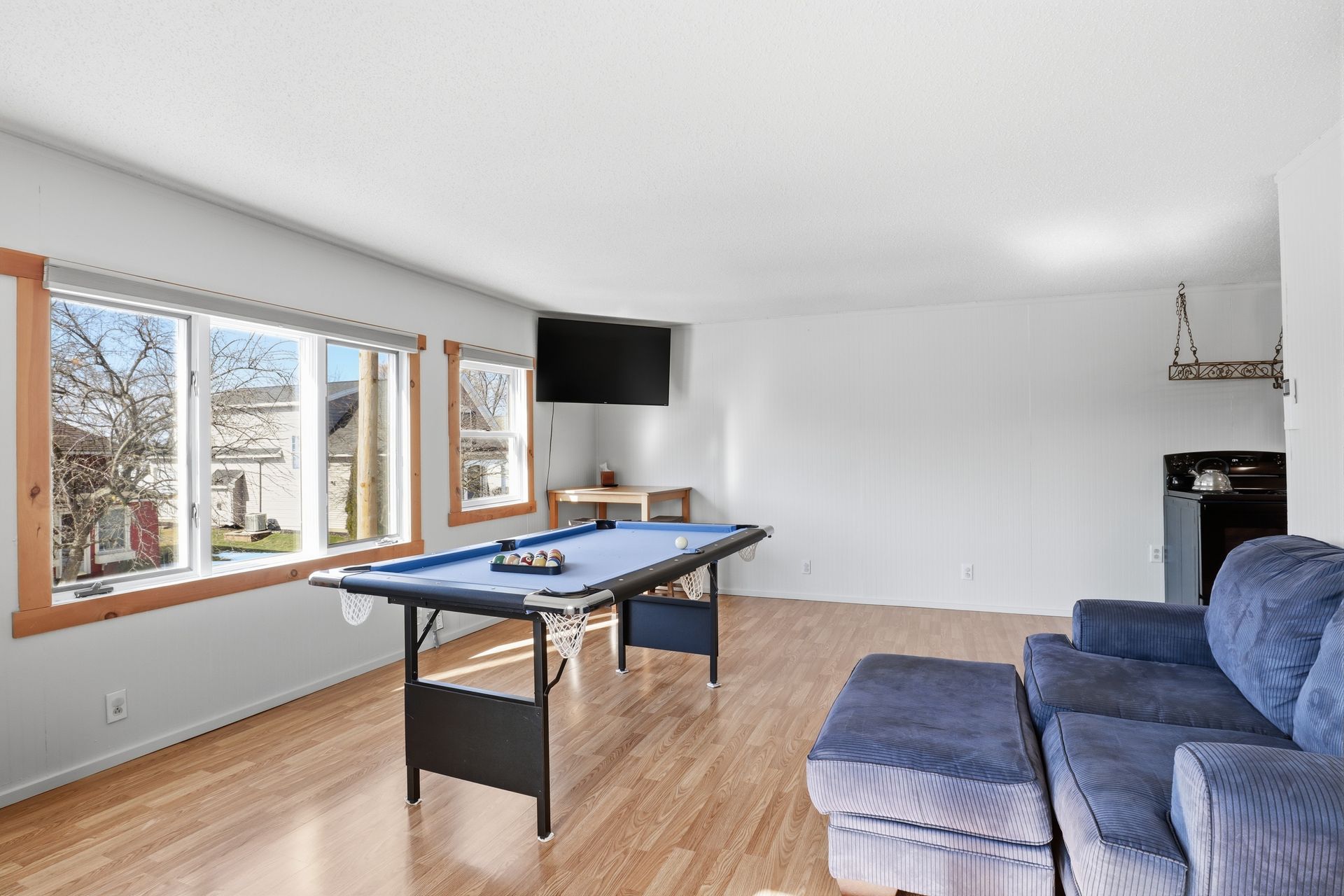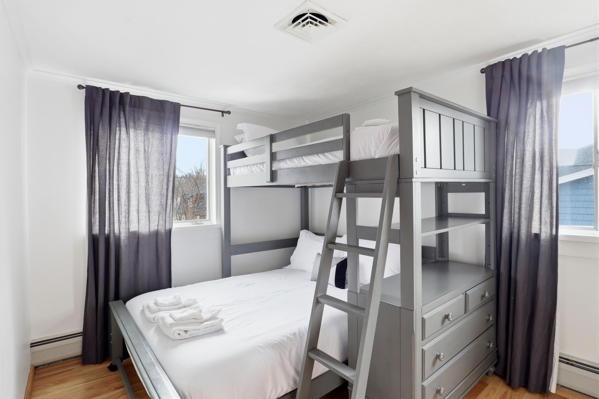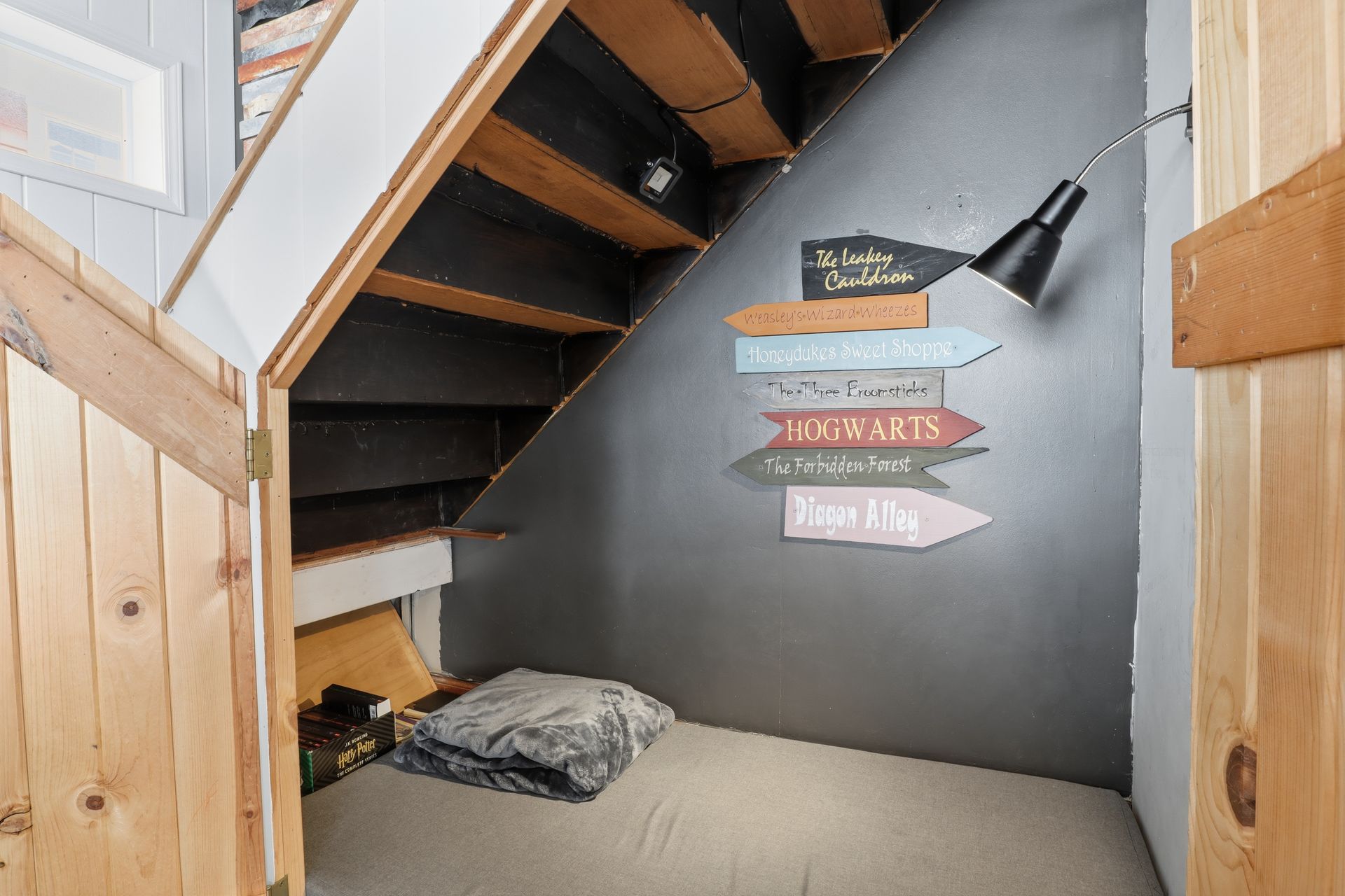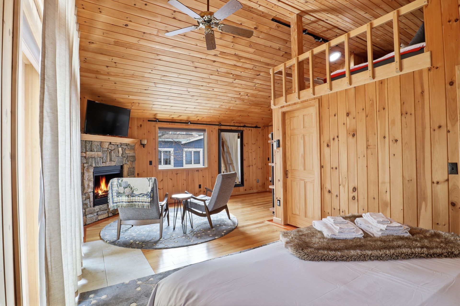 Kids and adults alike will enjoy the full size bed, bean bag chair, and library of books and games up in the elevated loft within the first floor master suite.