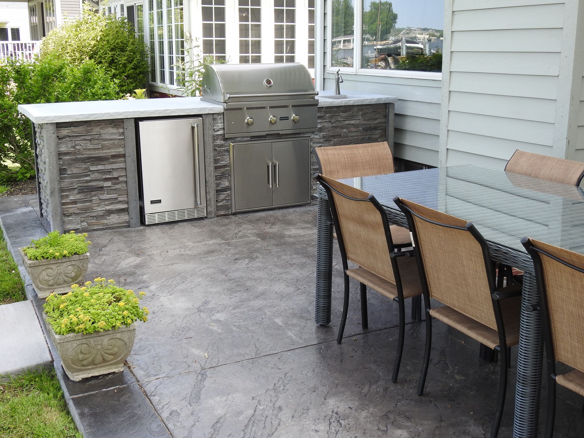 A fire pit, outdoor furniture, and outdoor kitchen with outdoor refrigerator, sink, and natural gas grill.